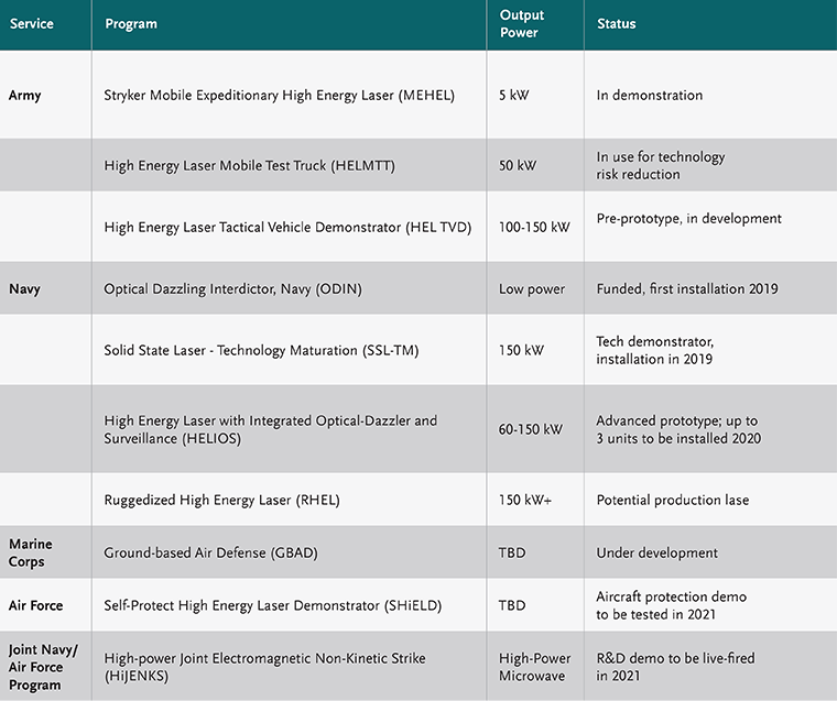 As a complement to kinetic weapons, Directed Energy weapons can provide enhanced and highly effective capabilities for boost-phase ballistic missile defense, hypersonic threats, unmanned systems, surface warfare, aerial defense, and asymmetric swarm threats to ships, aircraft, vehicles, and people.