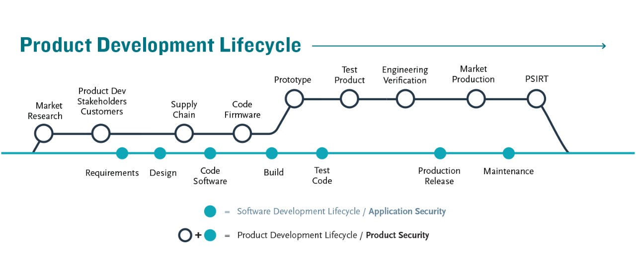 Today, “product” describes almost anything a consumer can purchase. It can be hardware and software, physical and virtual, local and remote, and enterprise and cloud. For example, an Intel microprocessor, the computer it powers, the operating system, and the packaged applications running on top of this operating system are all products. Product security targets the software development lifecycle (SDLC) phases to ensure the appropriate application of security across the development process. Product security incorporates the SDLC and the methods, interfaces, and external integrations required to create and move a product to market.