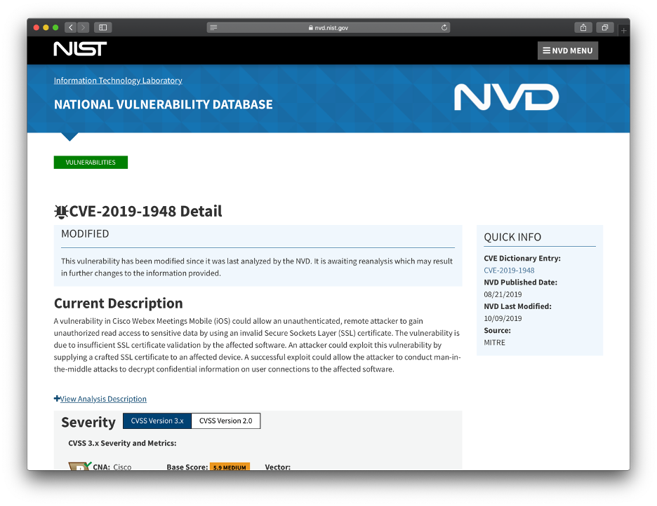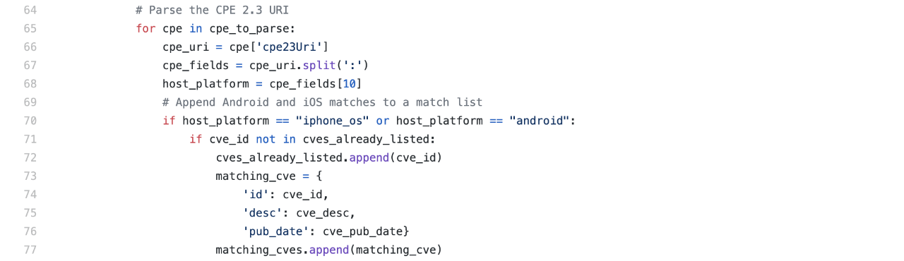 Fortunately, the Common Platform Enumeration (CPE) 2.3 specification has a "configuration" string that contains a label for the operating system of the affected software. For example, mobile app CVEs such as CVE-2019-1948 have either "android" or "iphone_os" listed towards the end of the CPE string. However, spotting mobile app CVEs, such as the one shown in Image 1: Example Mobile App CVE, is not as simple as browsing through a list of mobile apps on the NVD website.