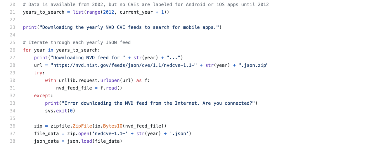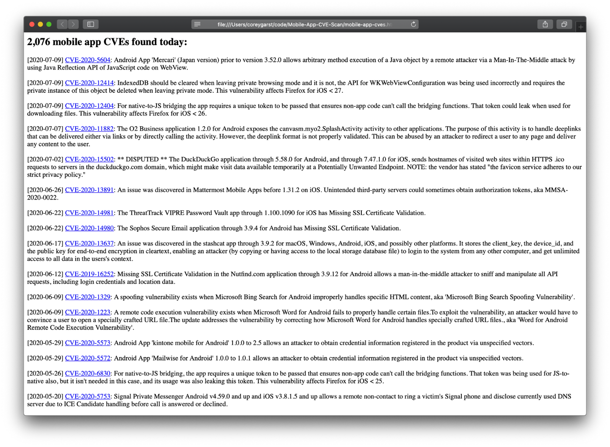 The Common Vulnerabilities and Exposures (CVE) system is the most widely used reference for publicly known software vulnerabilities and is accessible through the U.S. Government’s National Vulnerability Database (NVD). Though the database can be searched using keywords such as “Android” and “iOS” to spot some mobile app entries, unwanted results will appear such as platform vulnerabilities and many mobile apps CVEs will be missing.