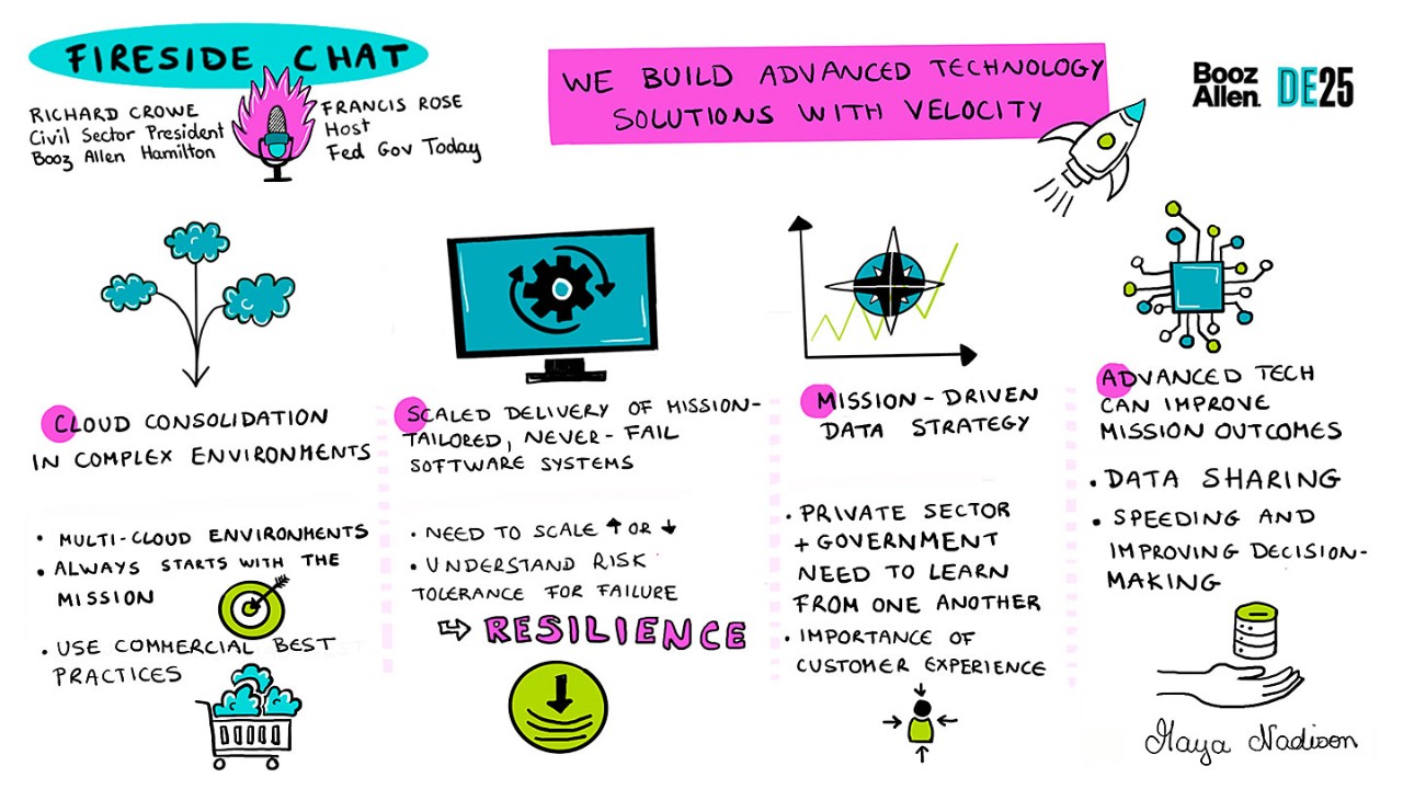 Key insights on cloud as an accelerator for government, as captured by graphical sketch artist, Maya Nadison, at the DE25: Driving Outcomes Through Data Event in Spring 2025.
