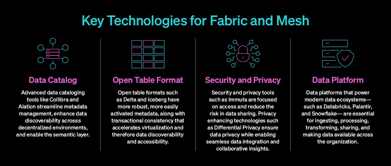 The taming of technology trendsetters: Integrating data mesh and data fabric requires leveraging cutting-edge technologies and robust tools. Some of them may already be in use, while others may need to be added to the stack. Vital to both data mesh and fabric are advanced cataloging tools like Collibra and Alation, which streamline metadata management, enhance data discoverability across decentralized environments, and enable the semantic layer. Open table formats such as Delta and Iceberg have more robust, and more easily activated metadata, along with transactional consistency that accelerates virtualization and, therefore, data discoverability and accessibility. Equally critical are security and privacy tools such as Immuta that focus on access to reduce risk in data sharing. Privacy-enhancing technologies, such as Differential Privacy, that ensure data privacy while enabling seamless data integration and collaborative insights will become increasingly essential for navigating regulatory complexities and driving mission innovation in modern data ecosystems. And, data platforms that power modern data ecosystems, such as Databricks, Palantir, and Snowflake, are essential for ingesting, processing, transforming, sharing, and making data available across the organization.