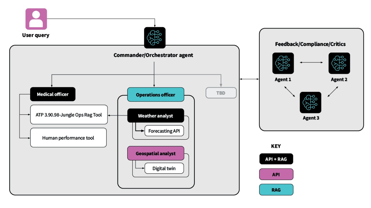 Agentic AI can revolutionize operational planning by enabling more dynamic and responsive decision-making processes. For example, a multi-agent system for operations planning could involve a centralized commander agent that orchestrates and dispatches tasks to specialized worker agents. These worker agents have the autonomy to use various tools to retrieve required information and execute specific tasks. The system incorporates a feedback loop that allows for collaborative critique and compliance checks on drafted plans, ensuring that the final course of action is both effective and compliant with strategic objectives.