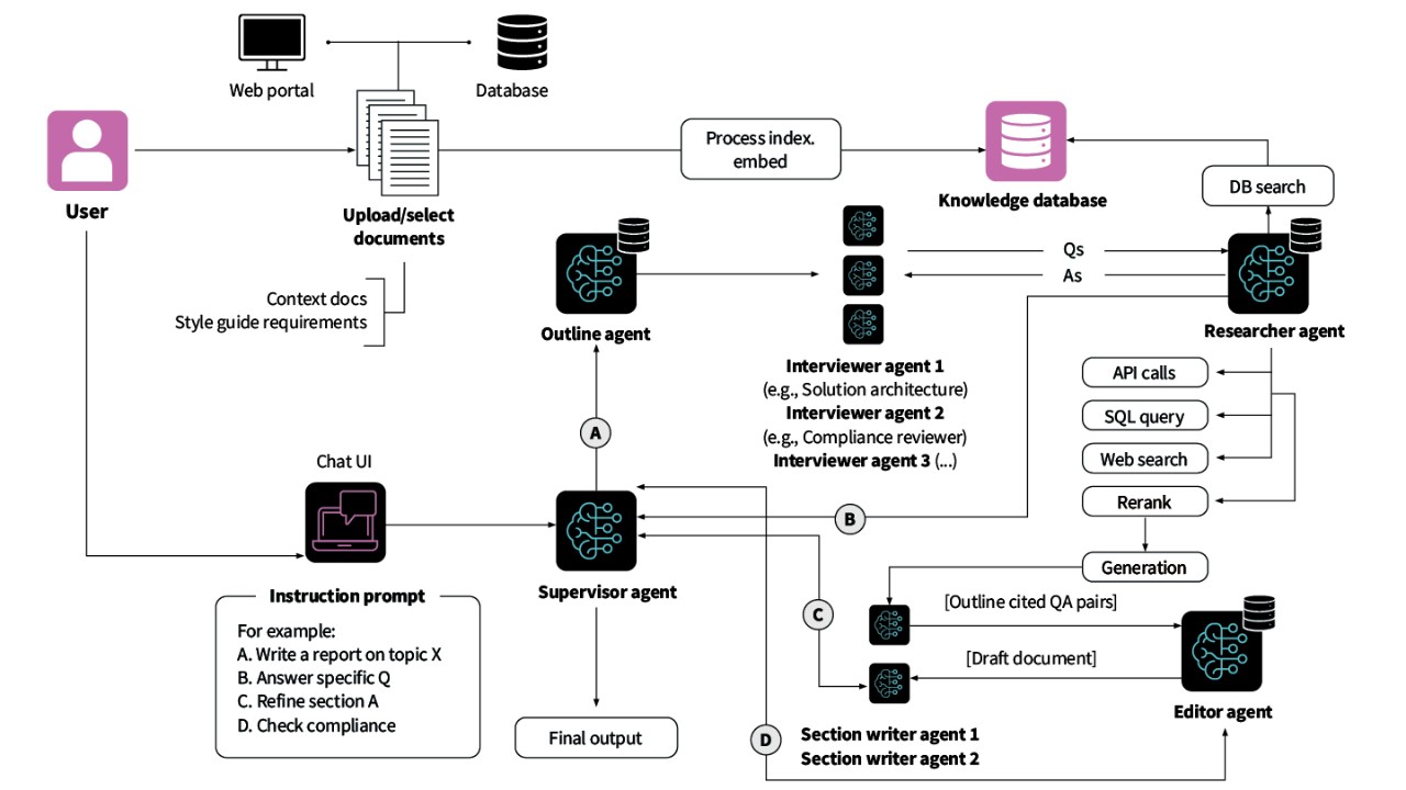 In a document authoring use case, a multi-agent system involves a supervisor agent that classifies user requests into predefined intents and initiates stepwise workflows. These workflows incorporate the interaction and collaboration of different document writing agents, each responsible for specific aspects of creating documents. The system follows sequential logic flows that mimic human writing behaviors, ensuring that the final document is coherent and meets the specified requirements.