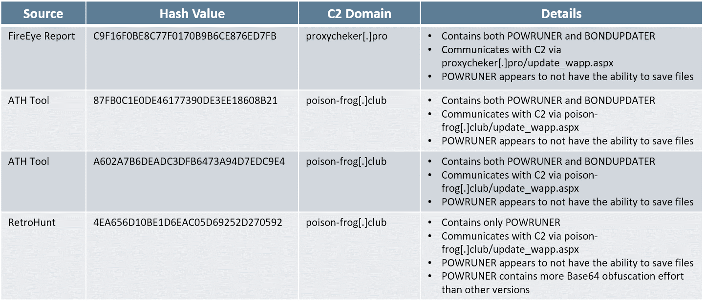 In early December 2017, FireEye released a report discussing recent activity, which they attributed to APT34. APT34 is a group that is thought to be involved in nation state cyber espionage since at least 2014. The FireEye report references binary (MD5: C9F16F0BE8C77F0170B6CE876ED7FB) which is a loader for both BONDUPDATER, the downloader, and POWRUNER, the backdoor. This loader connects to a known Command and Control (C2) domain, proxycheker[.]pro. Using this binary as a starting point, our DarkLabs team of Threat Hunters discovered three additional binaries that appear to be associated with APT34 activity.