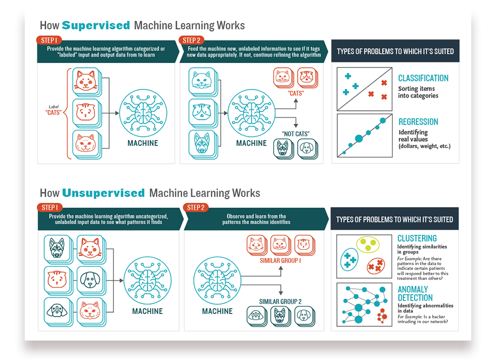 Machine learning algorithms are split into two main categories based on how they interact with data: Supervised and unsupervised. Due to their differences when analyzing data, these two machine learning categories are better suited for solving different problems. All forms of machine learning rely on the availability of a huge quantity of data to train algorithms. In the infographic below you’ll see how both supervised and unsupervised ingest this data and which problems they are suited for solving.