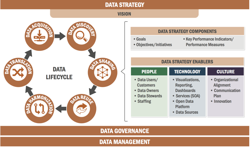 You start by asking yourself how you want to use your data to accomplish your mission. Then you establish goals, identify key people and technology, and consider cultural implications during each of the six phases outlined in the infographic below. Governance and data management underpin the framework and help guide you through the oversight, control, and execution of your data activities.
